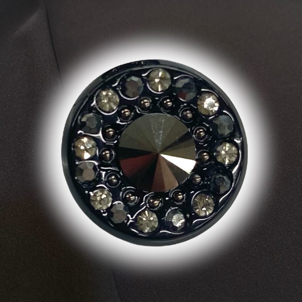 後ろのボタンには華やかな輝きを添えるものを選びました。ただし、裾までキラキラのボタンを並べると座ったときに当たりが気になるため、下の4つはスナップボタンに変更。