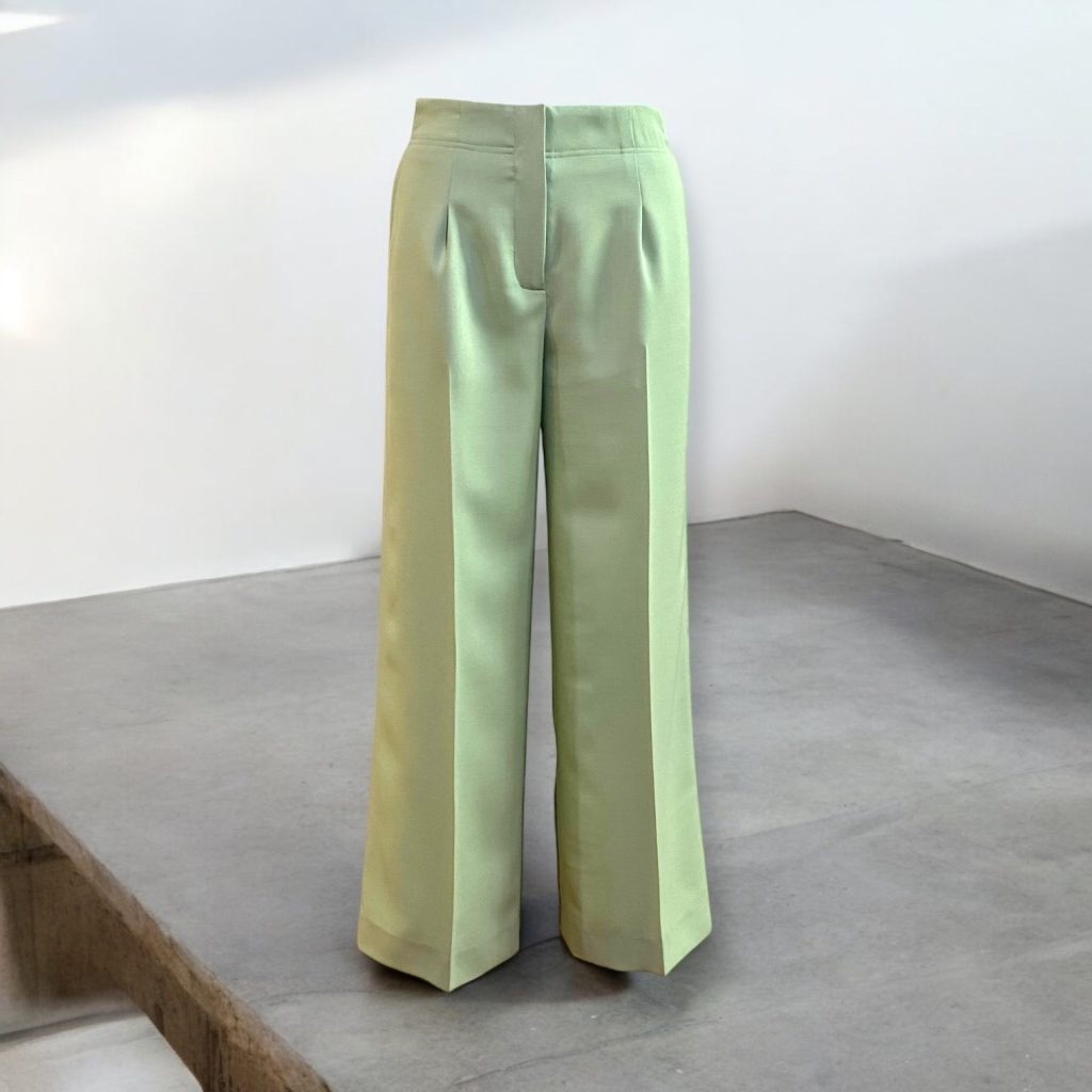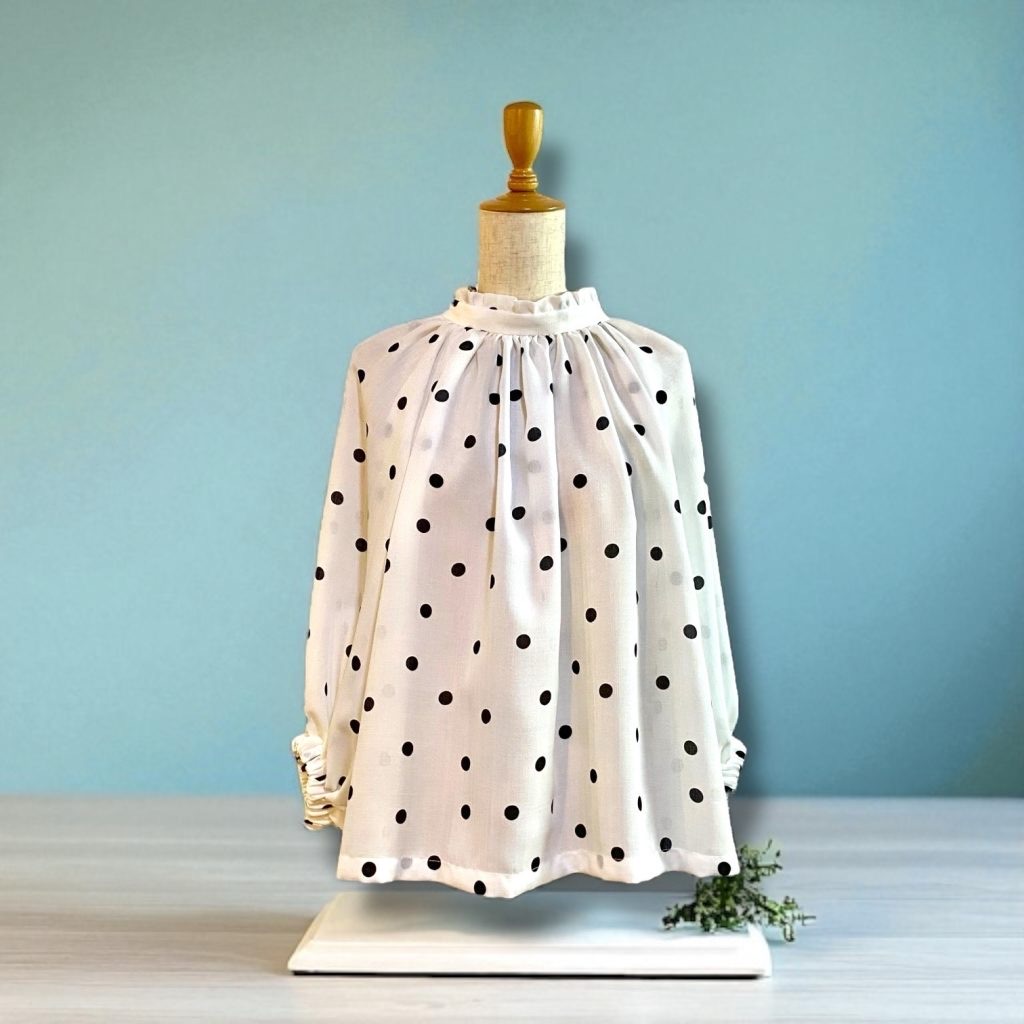 白地に黒のドットブラウスと柔らかなミントグリーンのパンツ。