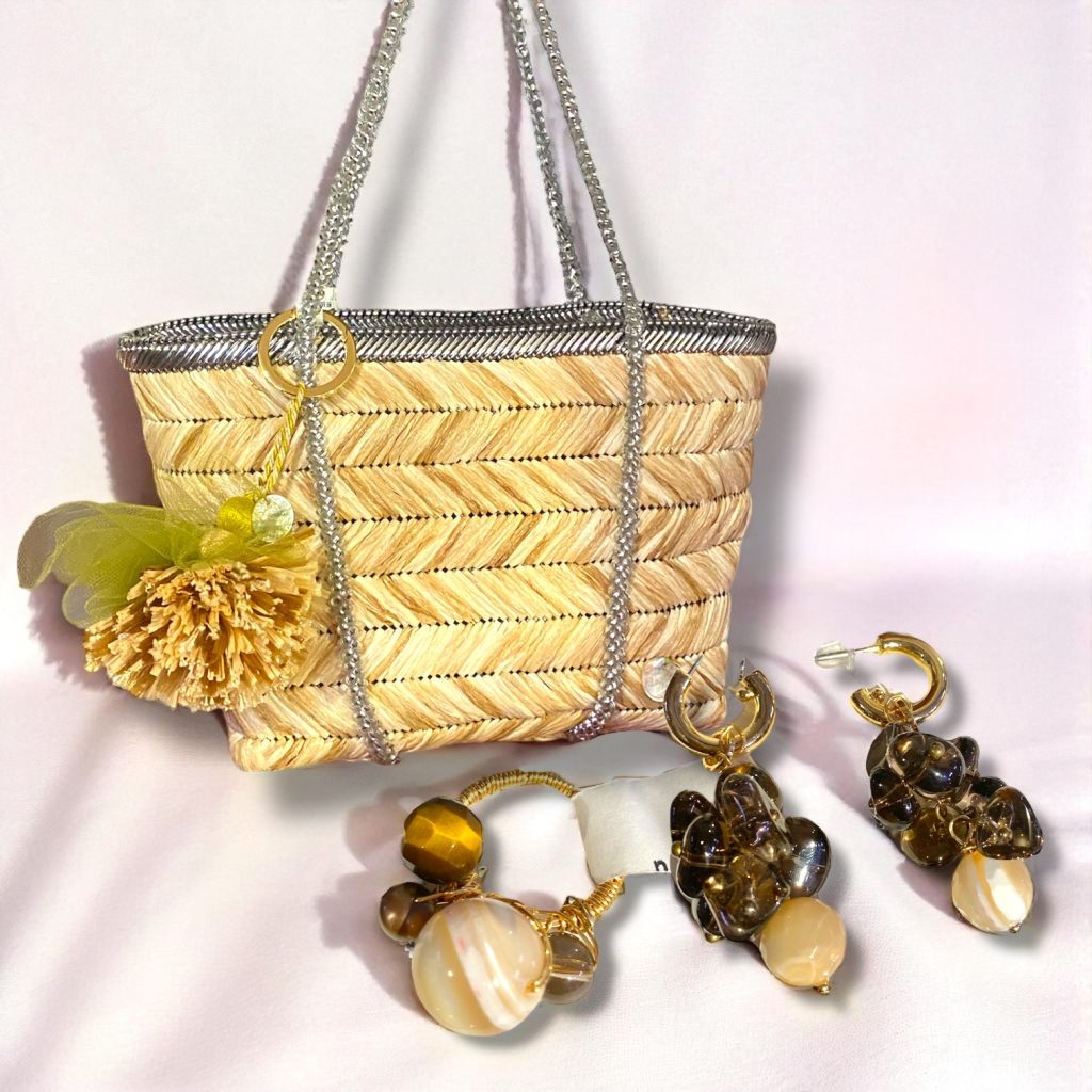 天然素材を丁寧に編み込んだバッグ、ガラスのように艶めく天然石のピアスやリングは、写真だけでは伝わらない独特の存在感があります。