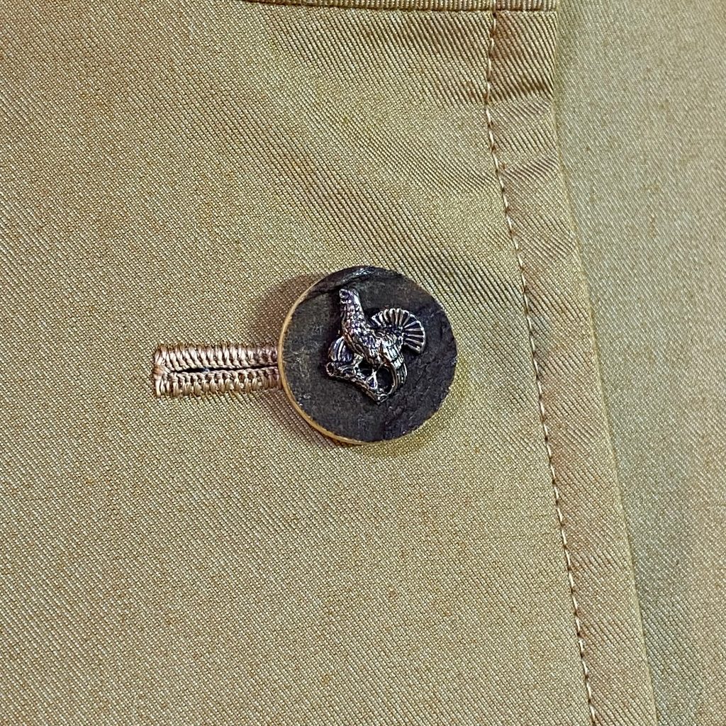 また、ボタンはお客様が長く大切に保管されていたものを持ち込みで。年月を経ても輝きを失わないボタンが、今回の生地とデザインにぴったりと調和しました。