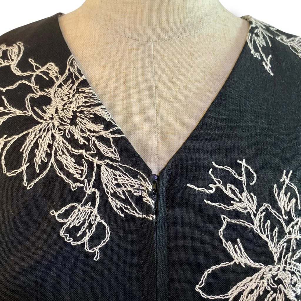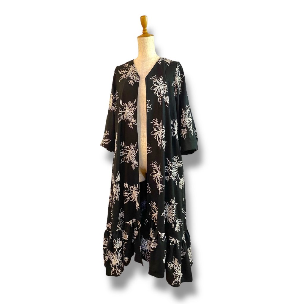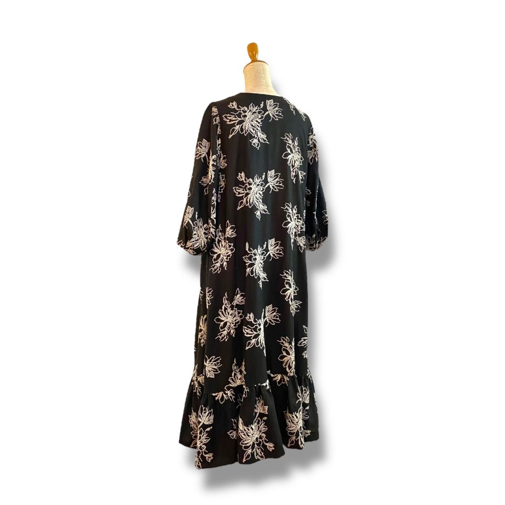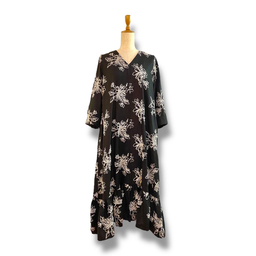 黒地に白の花柄刺繍が浮かび上がり、動くたびに表情を変えるのがとても美しいポイントです。
