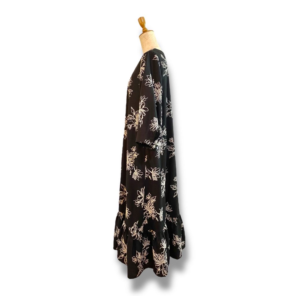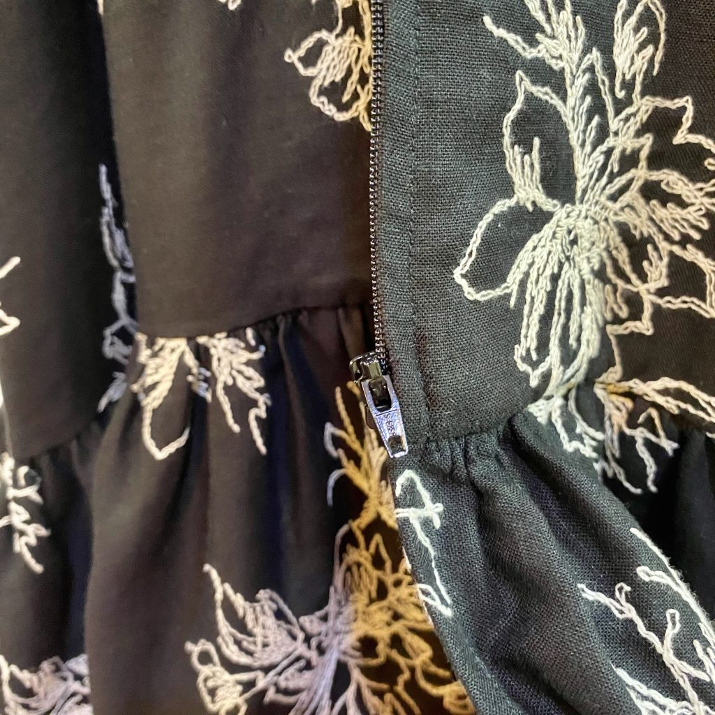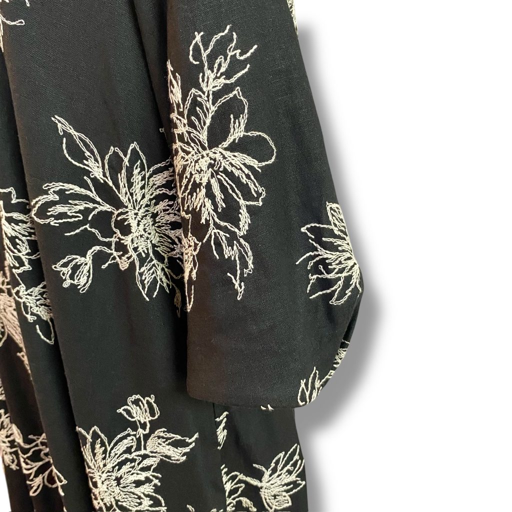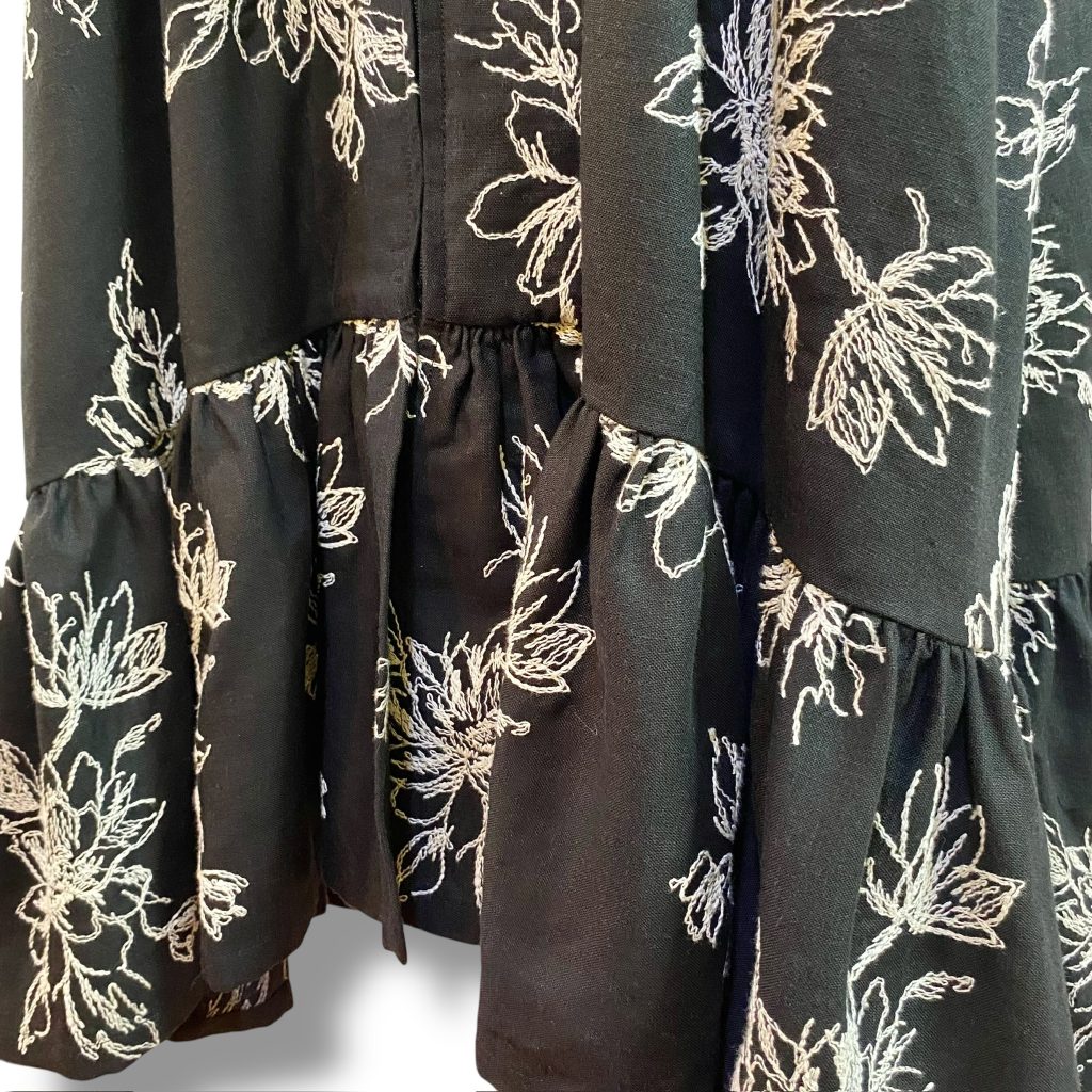 黒地に白の花柄刺繍が浮かび上がり、動くたびに表情を変えるのがとても美しいポイントです。