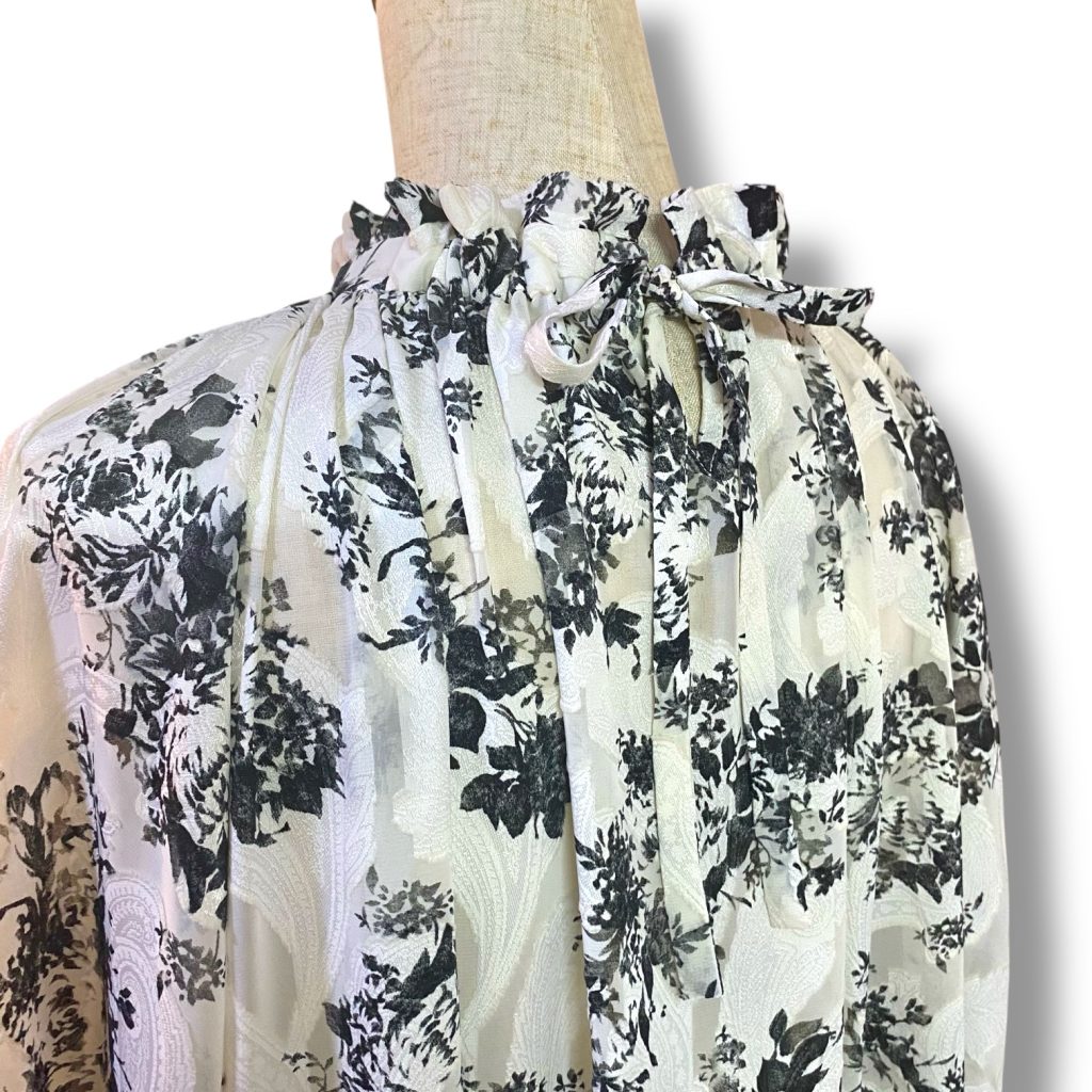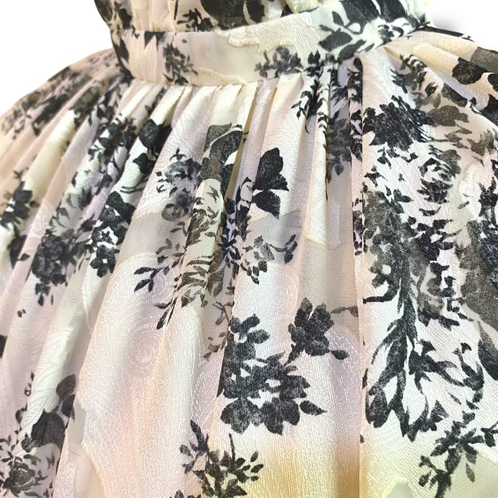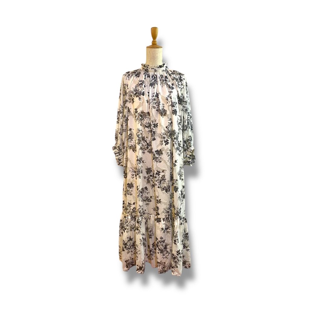 軽やかなシフォンにジャカード織りで花模様をのせた、フリル襟のワンピース。