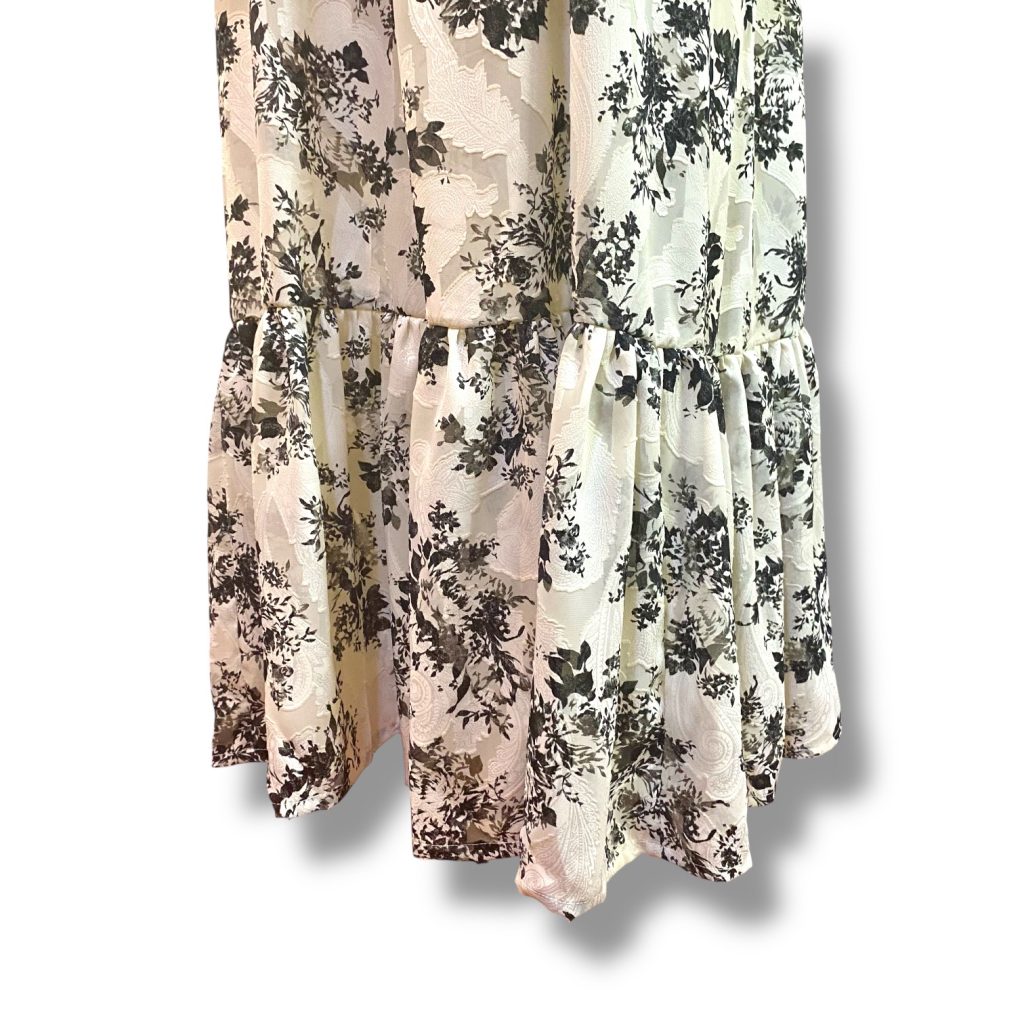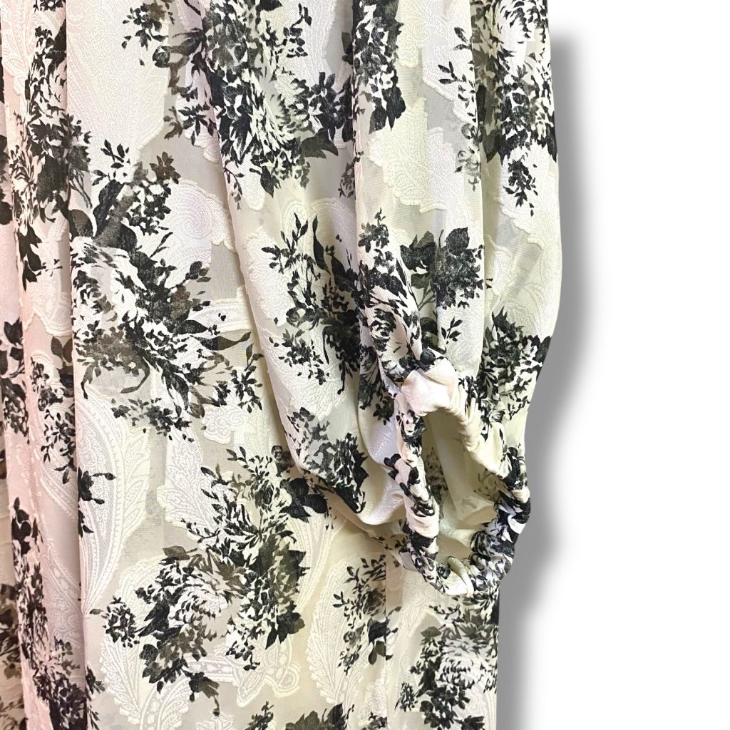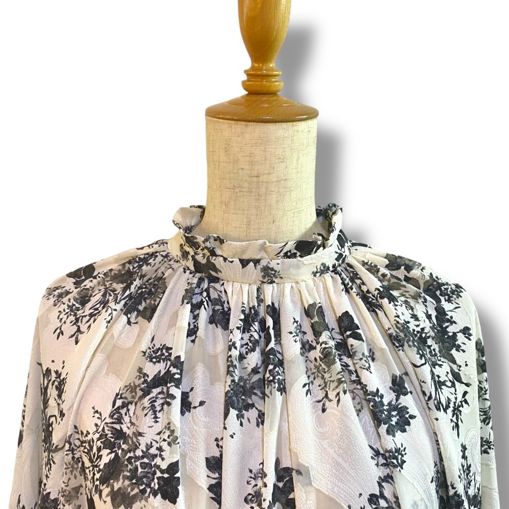 軽やかなシフォンにジャカード織りで花模様をのせた、フリル襟のワンピース。