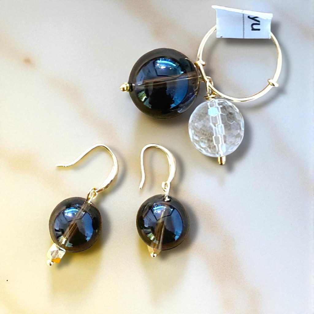 深みのあるクオーツのピアスとリングは、角度によって輝きを変え、耳元や指先に気品を添えてくれます。