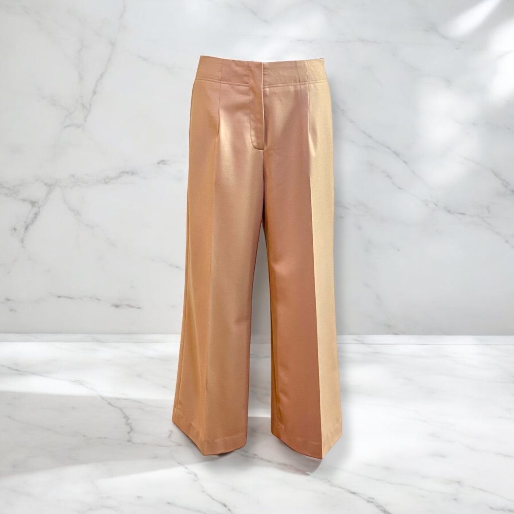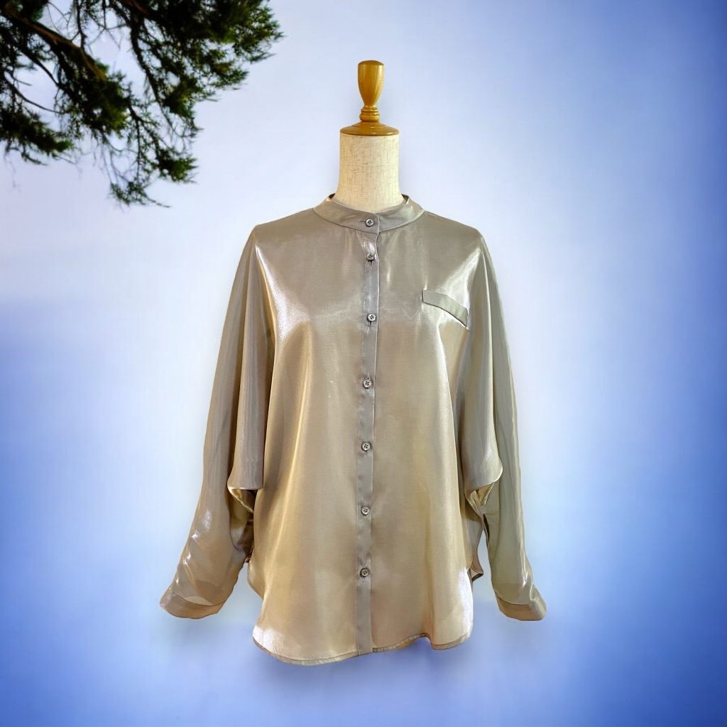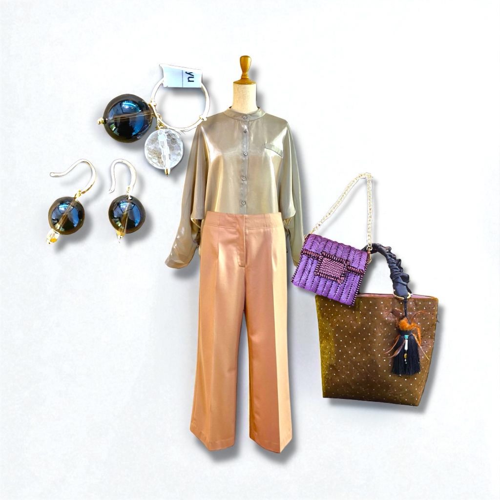 光沢のあるブラウスと落ち着いたトーンのパンツ。