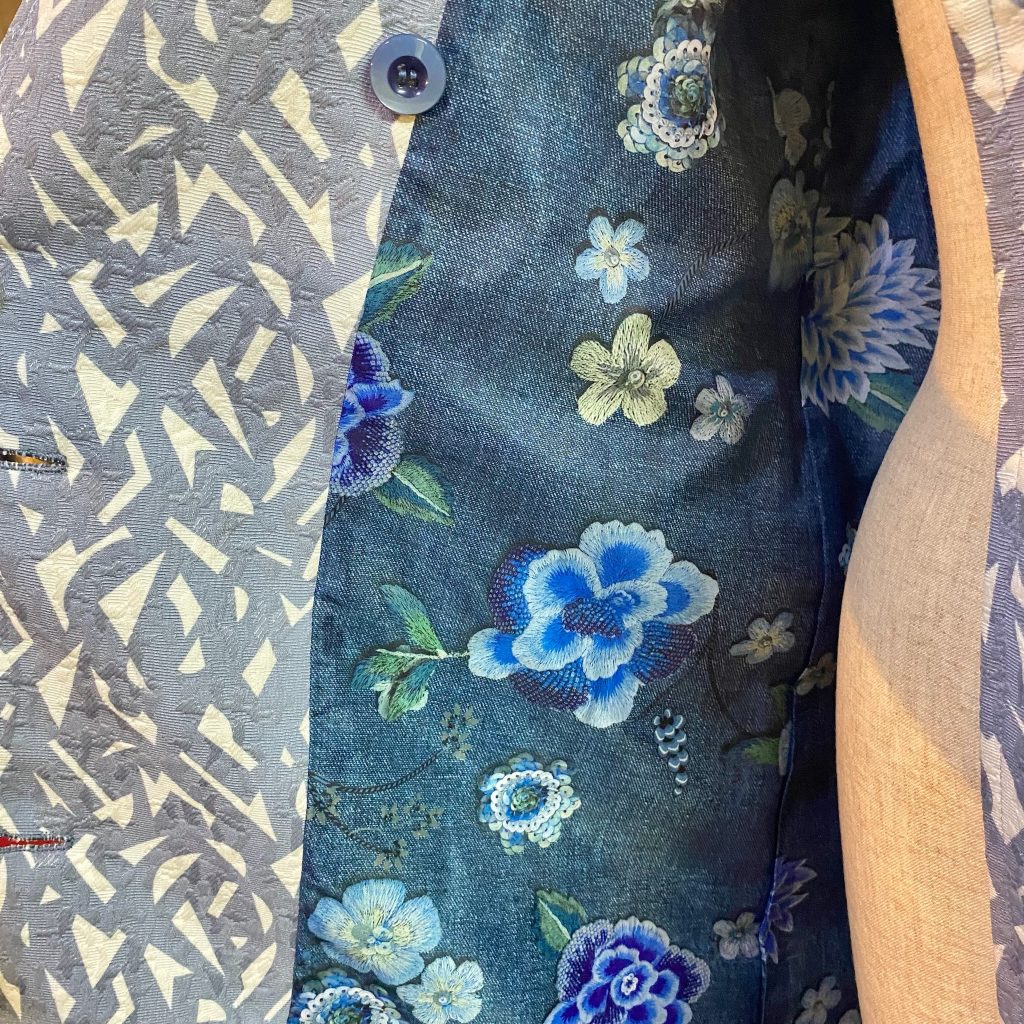 そして裏地には、深みのあるブルーに、花々が咲きこぼれるような生地をセレクト。