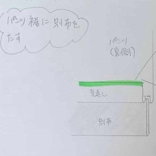 生地は二重にして、パンツの「縫い代」と「見返し」の間に挟み込む仕様に。
