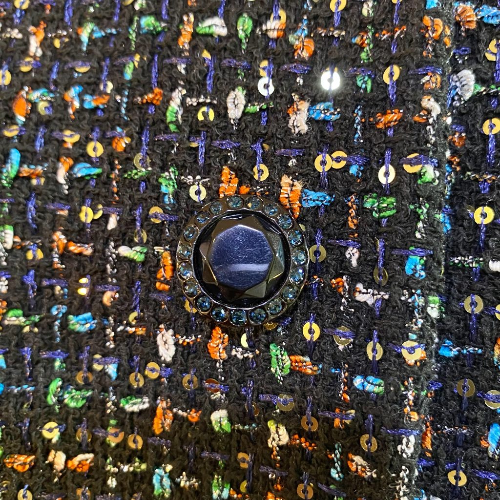 黒をベースに、オレンジ・ブルー・グリーンなどの糸が織り込まれたイタリア製のツイード。
