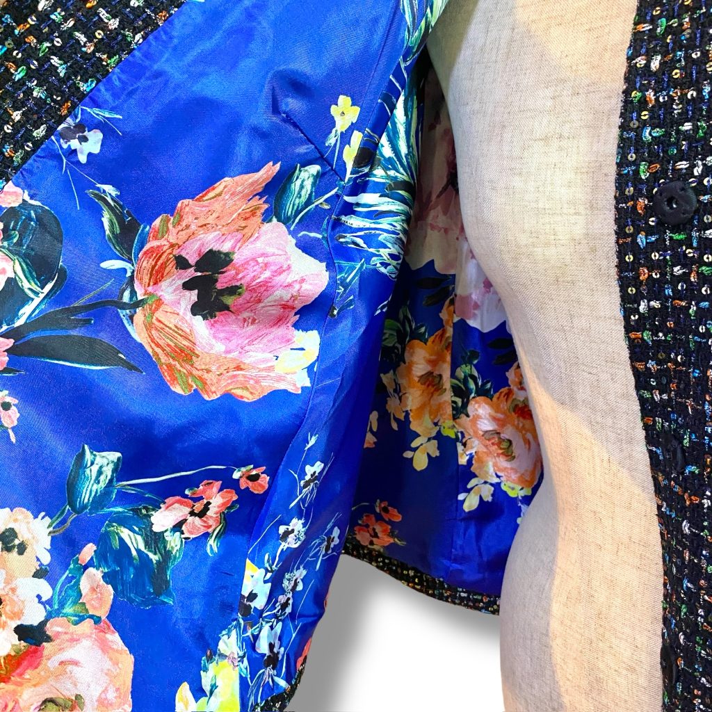 内側には鮮やかなフラワープリントの裏地を使用。