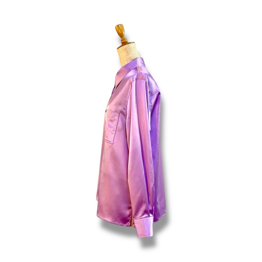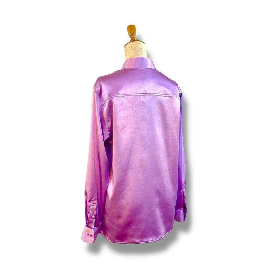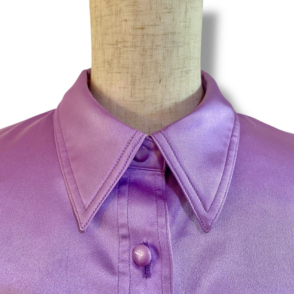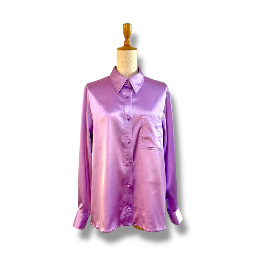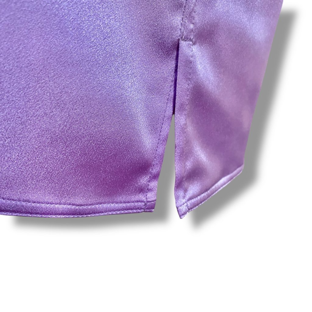 肌をやわらかく包み込むようなサテンの質感と、光の角度で変わるライラックの艶が印象的です。