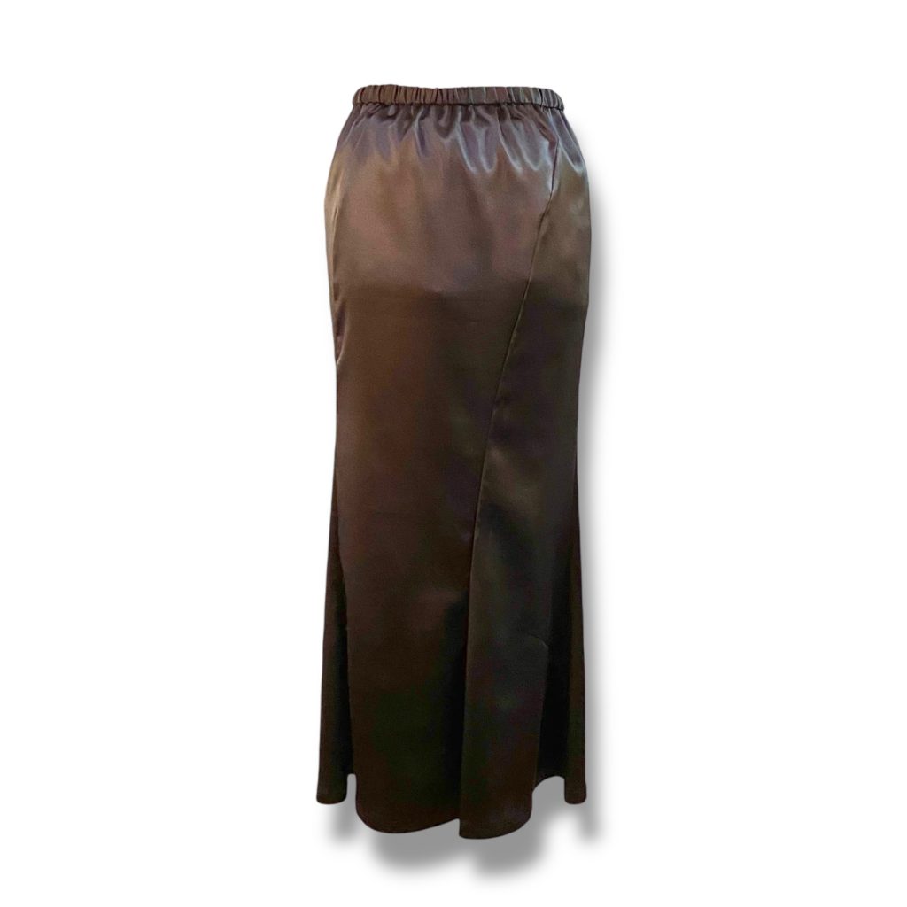 同素材のブラックサテンで仕立てたマーメイドスカートは、なめらかな落ち感と控えめな光沢が美しく、セットアップで着ると特別な存在感を放ちます。
