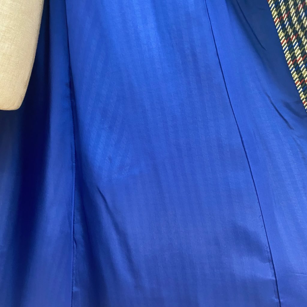 裏地には鮮やかなブルーを選び、歩くたびにちらりと見える色のコントラストが、装いに華やぎを添えます。