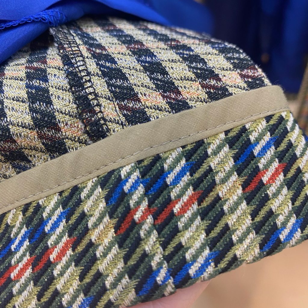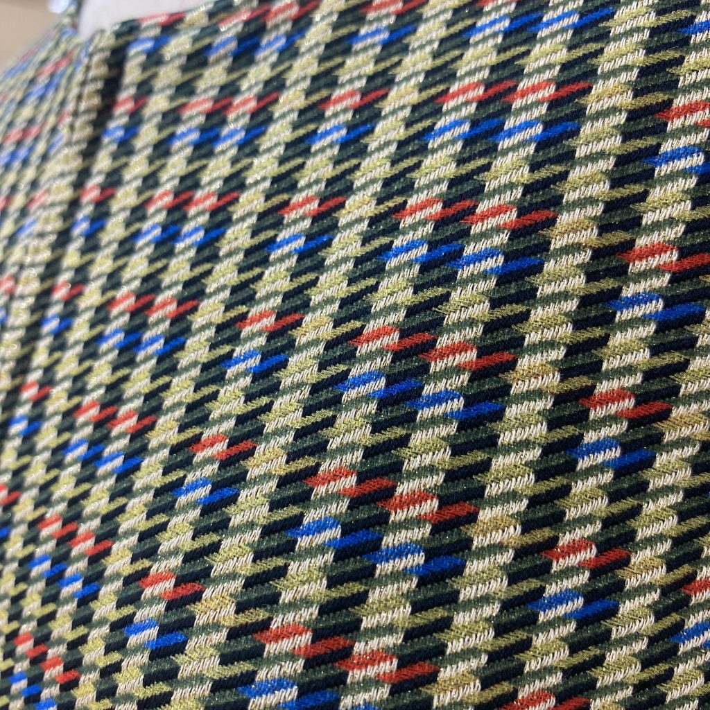 一見クラシカルなチェック柄ですが、よく見ると赤や青のラインの中に、ほのかに輝くゴールドのラメ糸が織り込まれています。