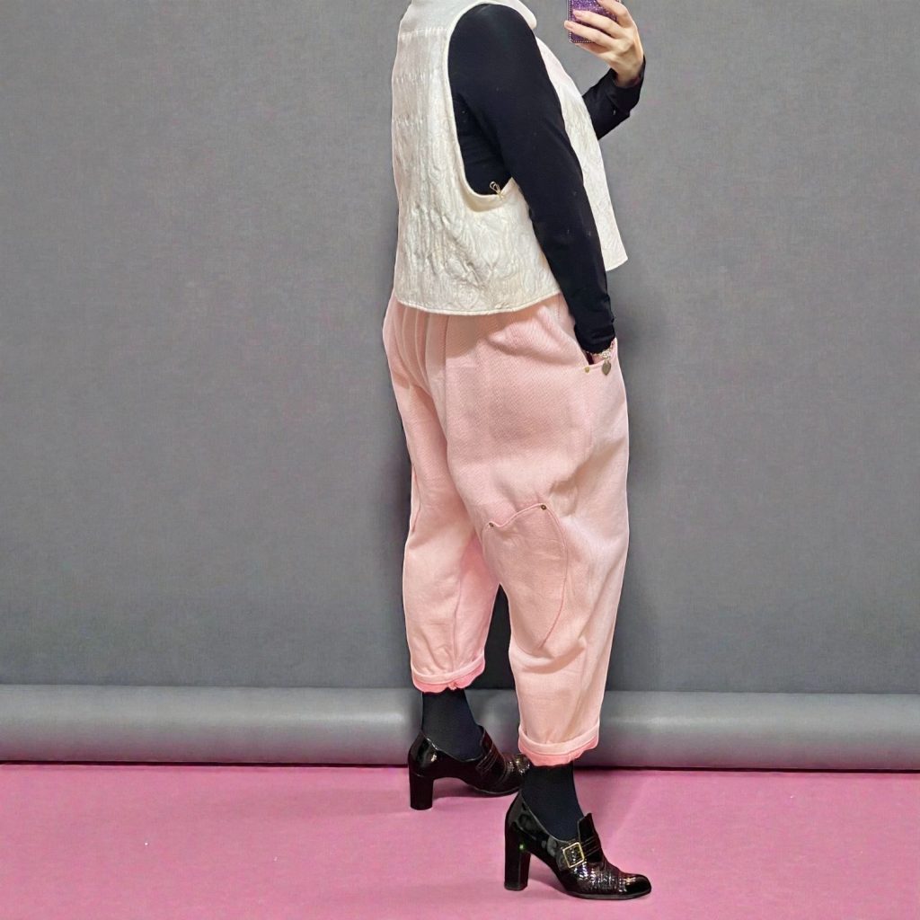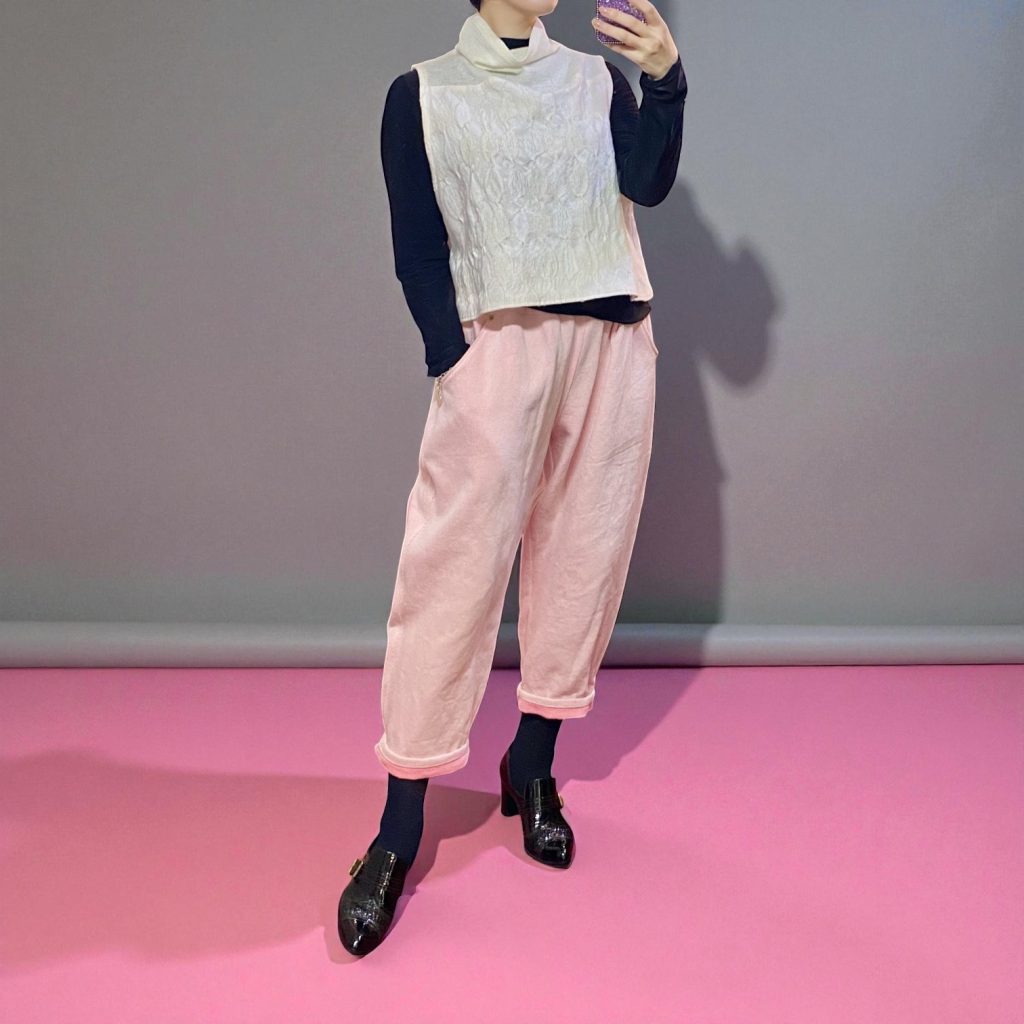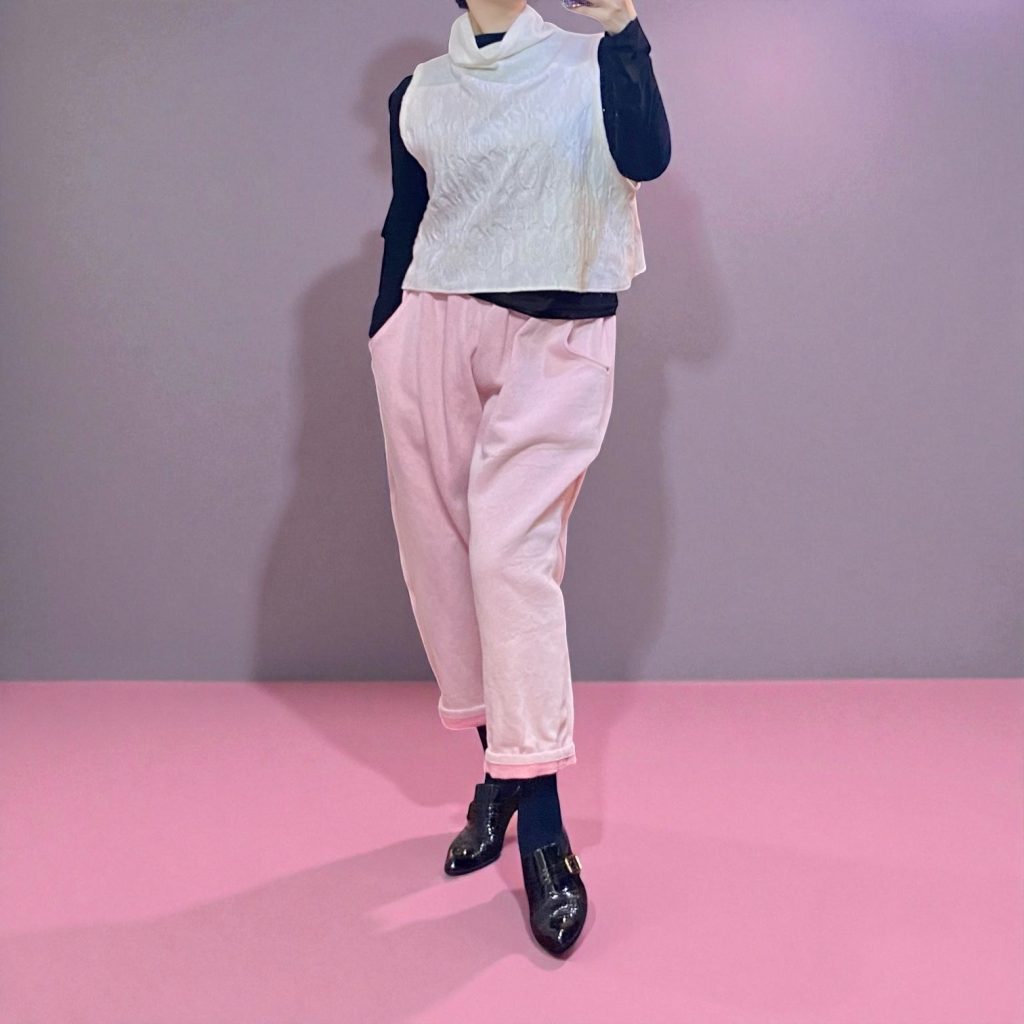 トップスとパンツを合わせると、柔らかく、ふんわりして見えるのに幼くならないバランス。