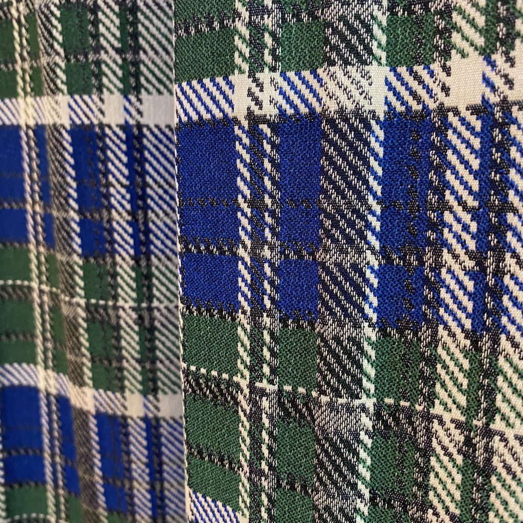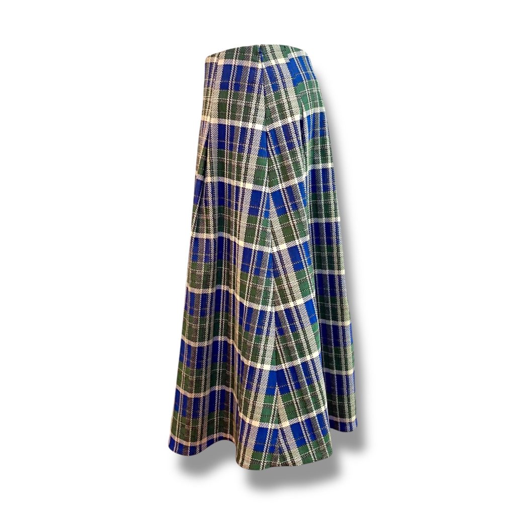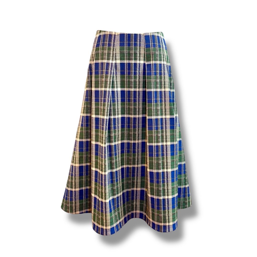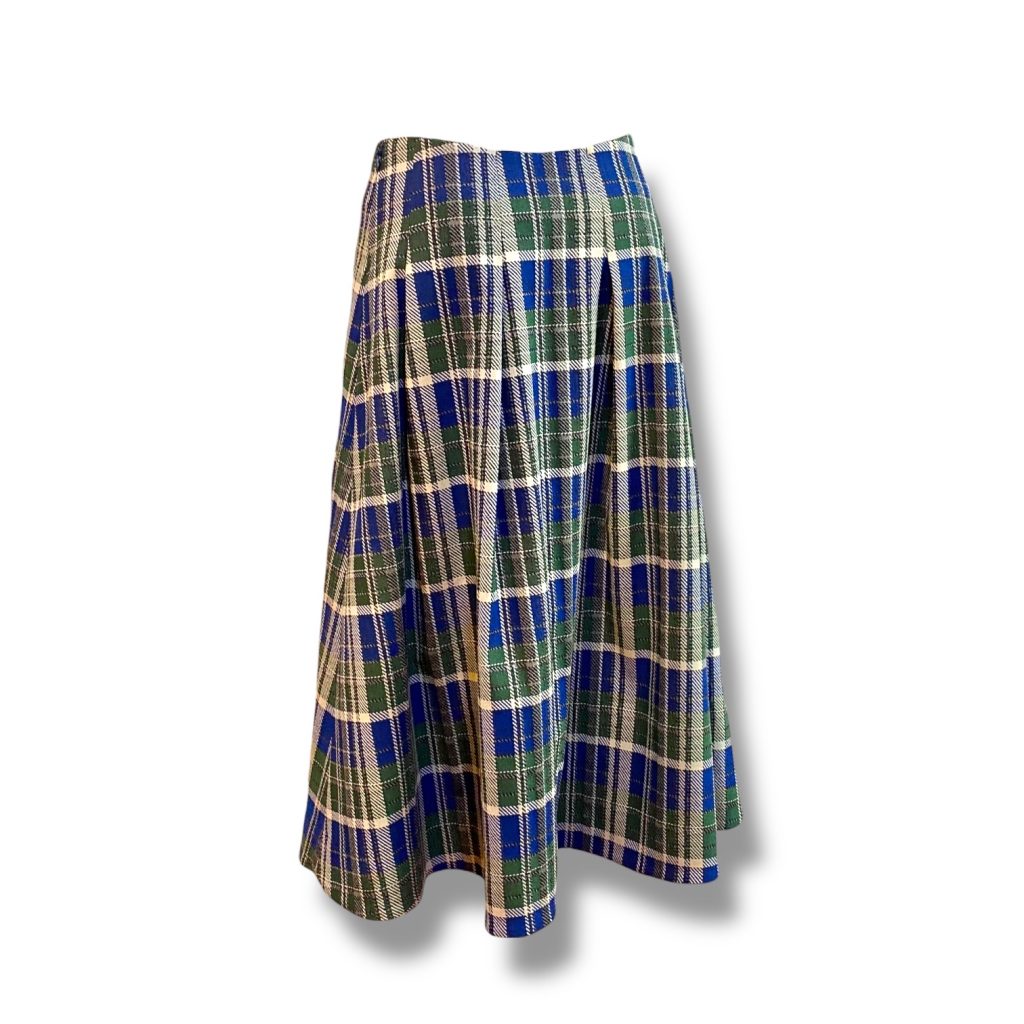 イタリア製のブルーとグリーンが重なり合うチェック柄を一目見て選ばれ、今回のソフトプリーツスカートが完成しました。