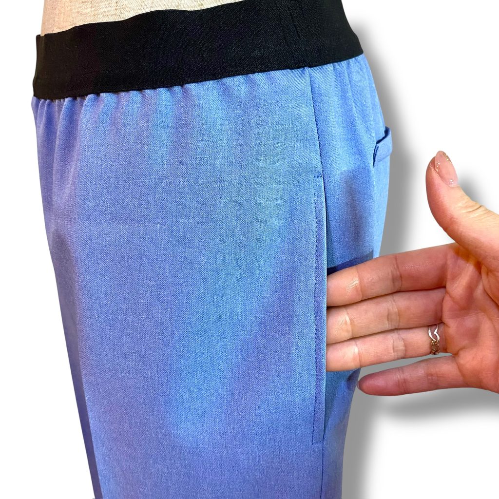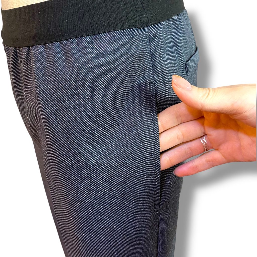 程よいフィット感がありつつ、ウエストは総ゴムで楽に履けるため、見た目のきちんと感と着心地の良さが両立しています。