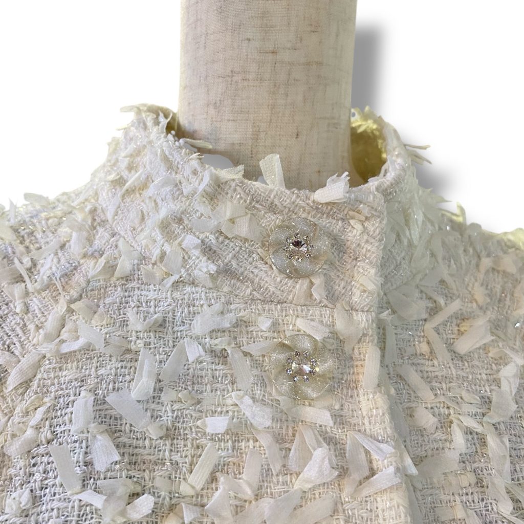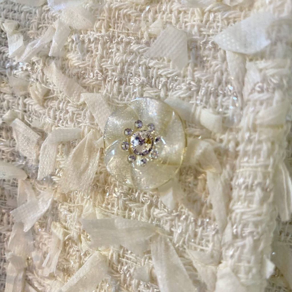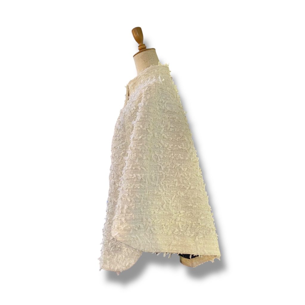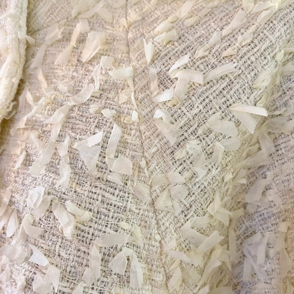 織りの中に、リボンのように細く裂かれた糸が散りばめられ、白一色でありながら、動くたびに表情が変わります。