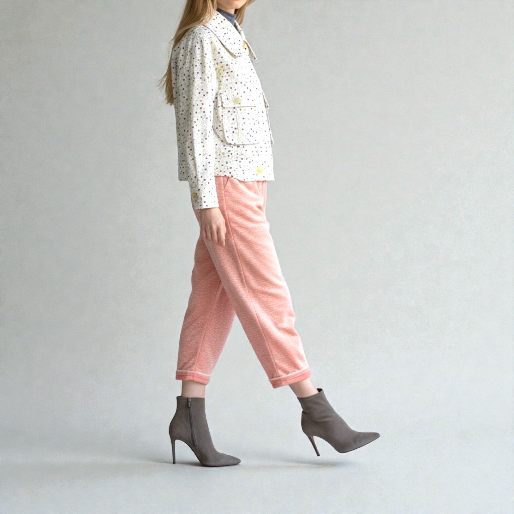 パンツのやわらかなピンクと、表情のあるジャケット。
