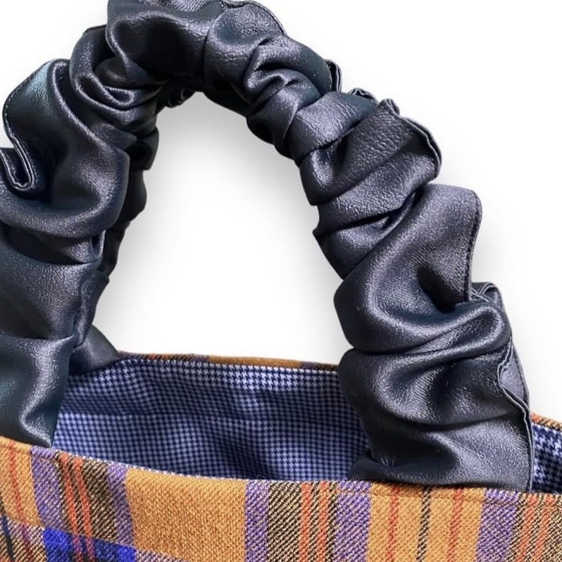 ギャザーがきれいに出る、硬すぎないレザーライクな生地を選び、サブバッグとしてもメインバッグとしても持てる佇まいと、持ちやすさを大切にしています。