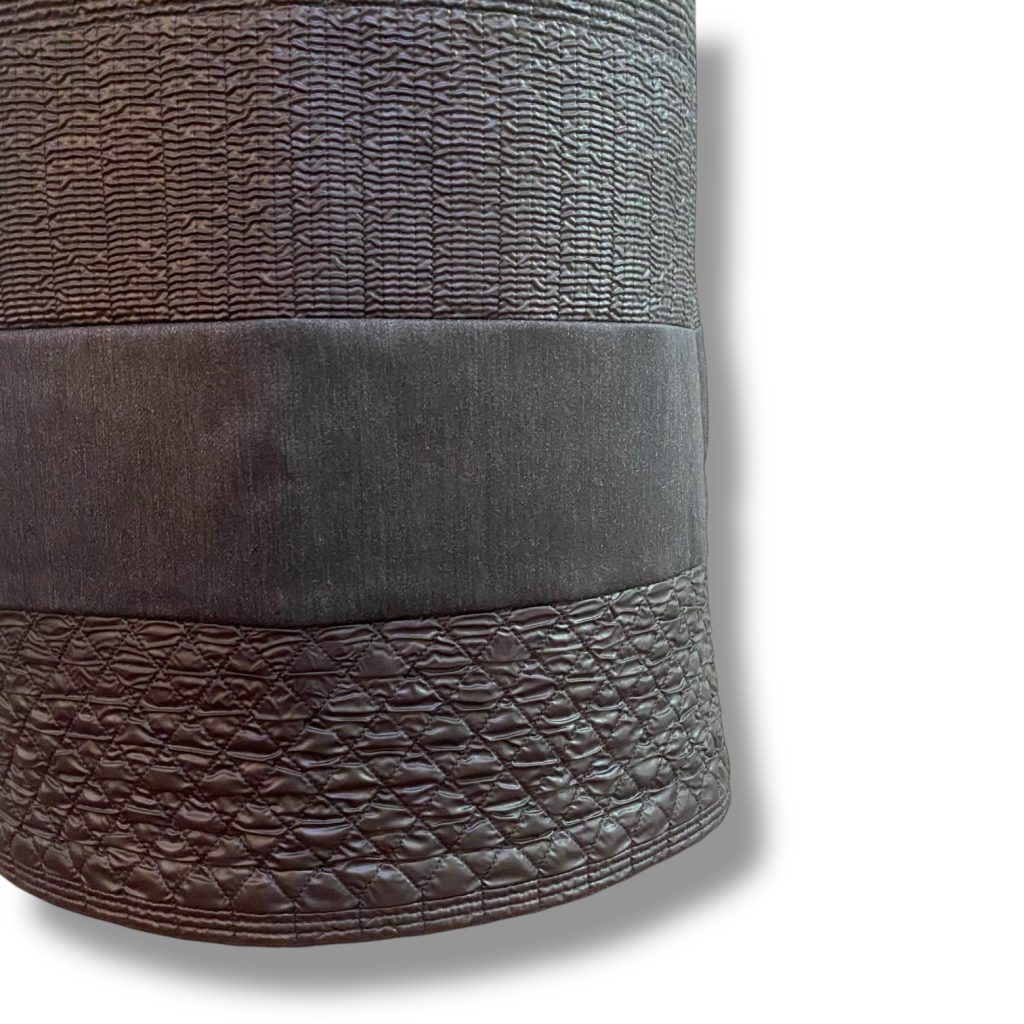 黒のスカートということもあり、黒の生地を足すことも考えましたが、真っ黒よりも、ほんの少し表情のある色の方が自然に馴染むと感じ、チャコールグレーの上質なウール生地を選んでいます。