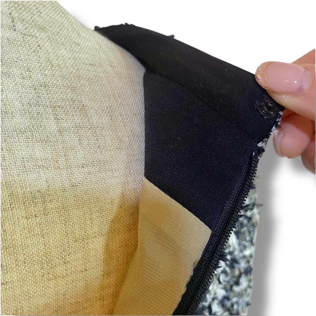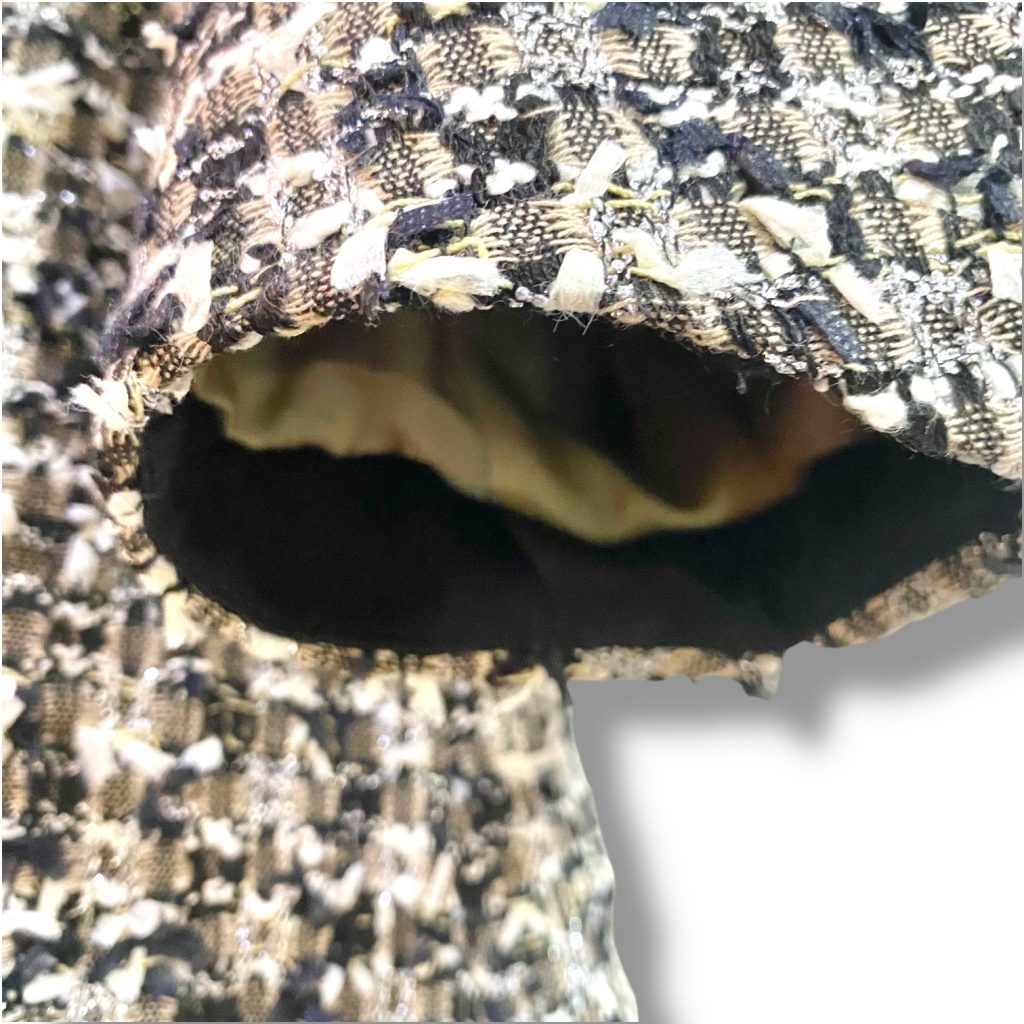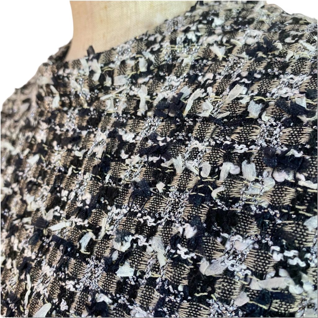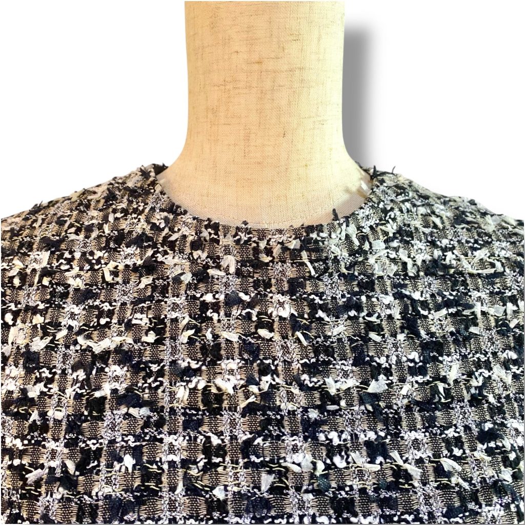 ツイード特有の質感が直接肌に触れすぎないようにしながら、黒とベージュのコントラストがさりげないアクセントになりました。