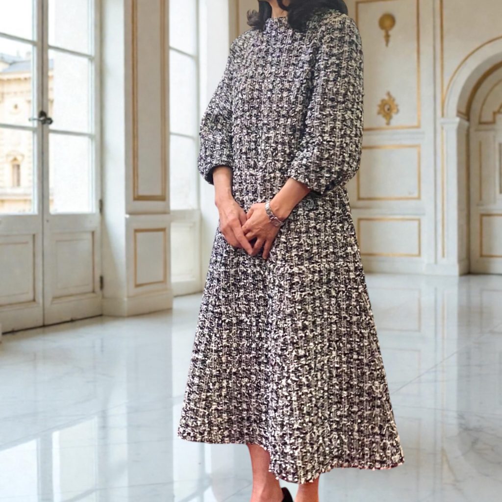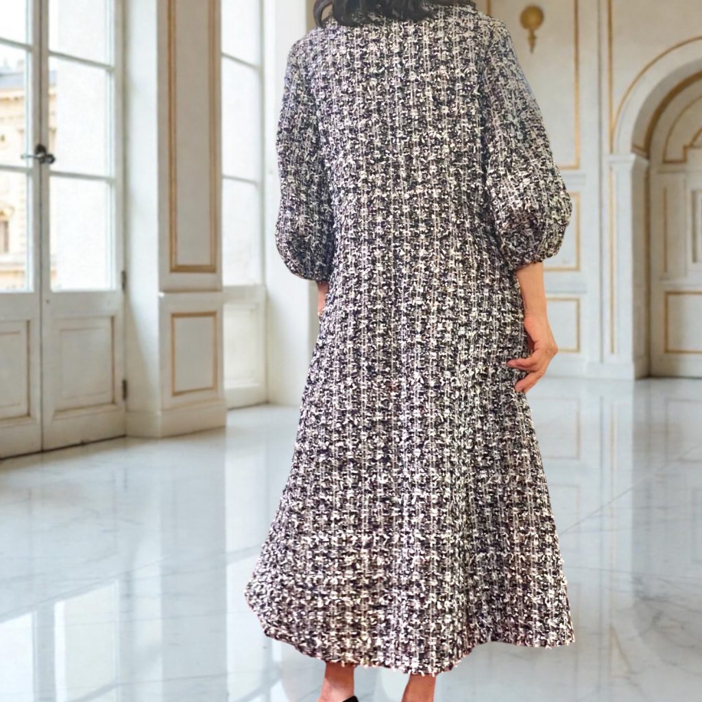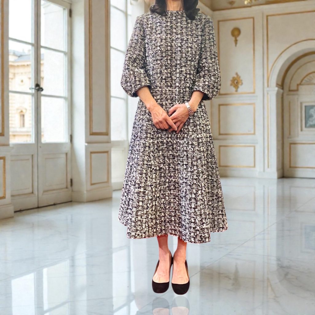 動いたときの裾の広がりも、ツイードならではの表情で、凛とした存在感をまといます。