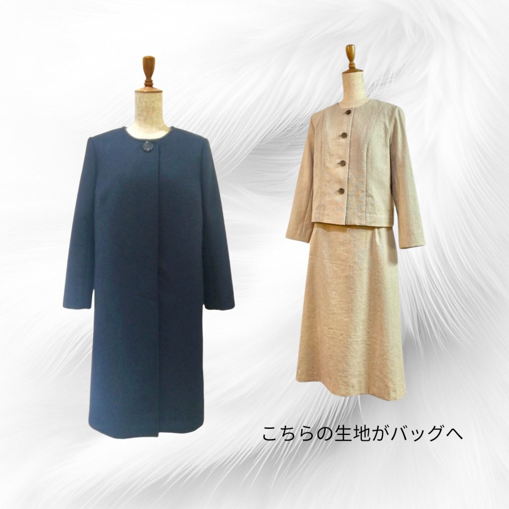 バッグは、最近ジャケットとスカートをお仕立てした際の残り生地を使い、バッグ作家さんにお願いして作られたものだそうです。