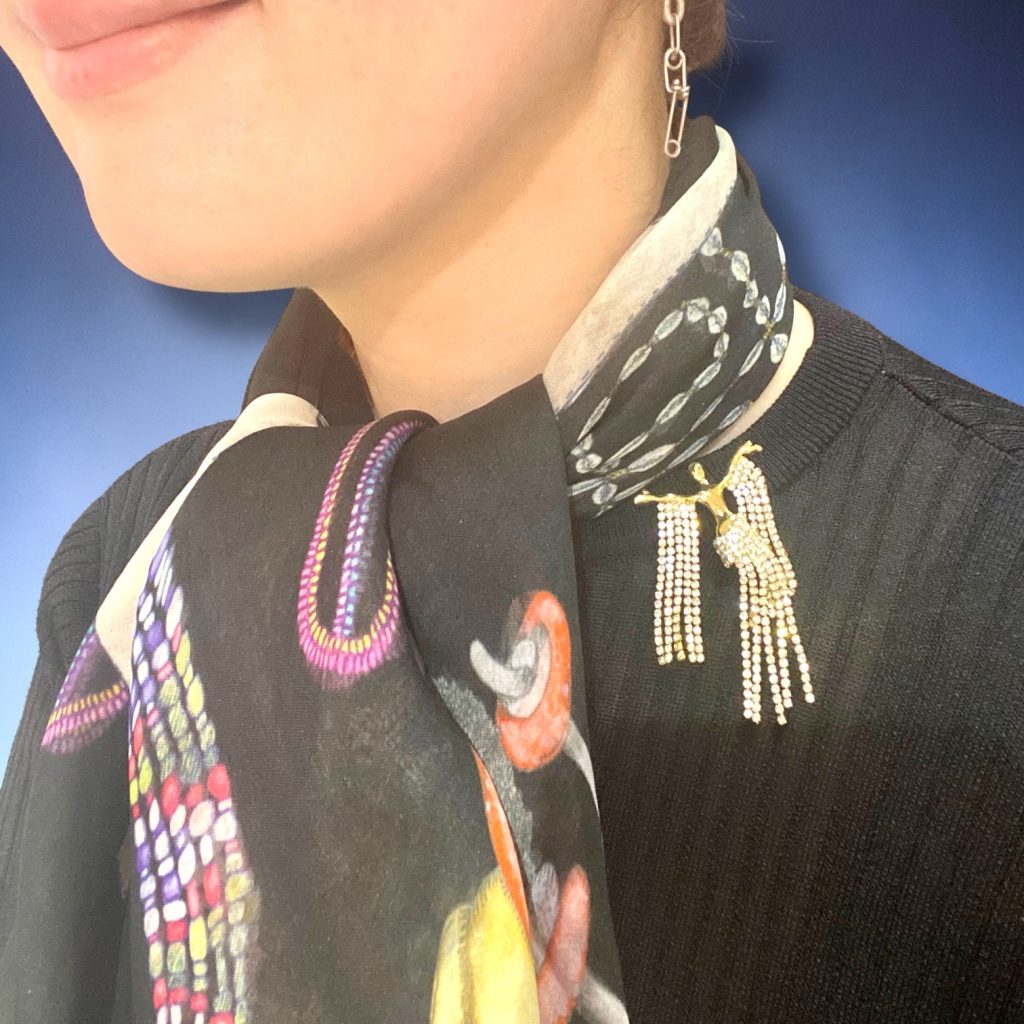 今日は、黒のニットにリネンのブラックパンツ、そしてブラックのプリントシルクのスカーフを合わせた装い。
