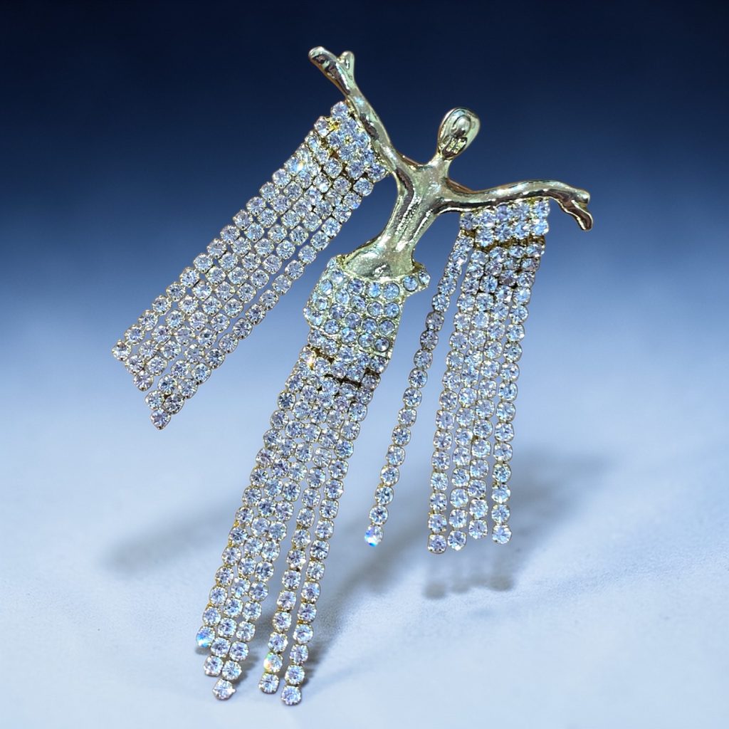 両手をあげた女性のシルエットから、ラインストーンが流れるように揺れるデザイン。