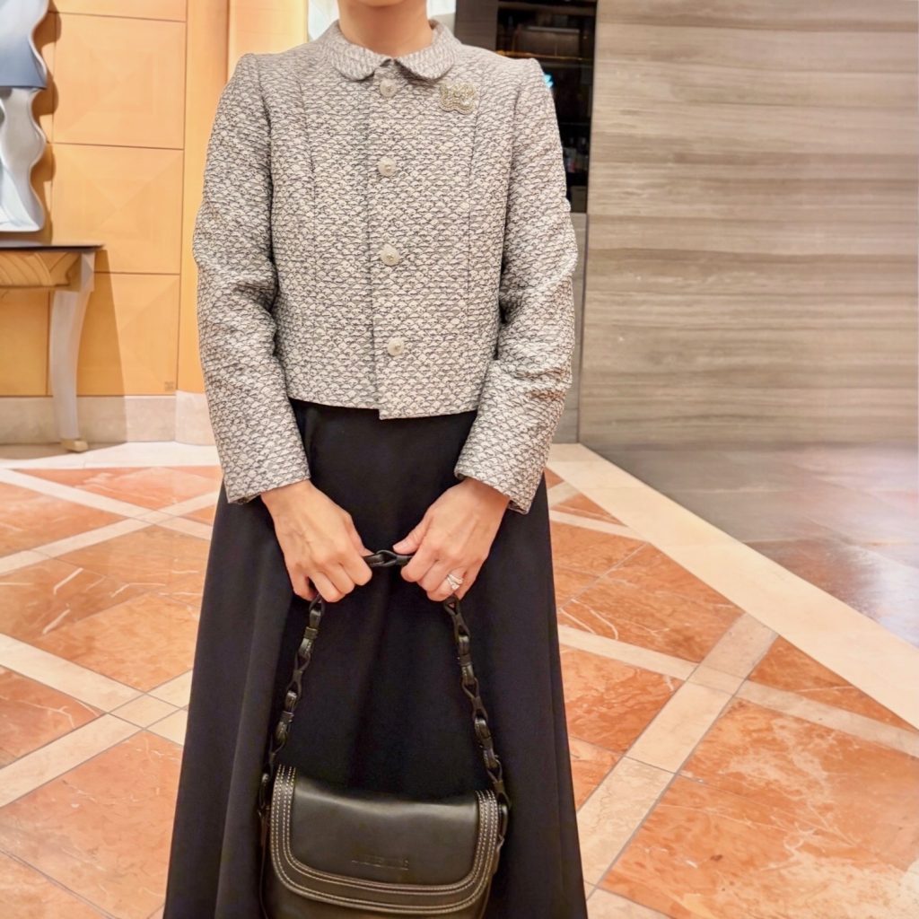 結婚式に着ていくお洋服として、メゾンドエヌのジャケットとワンピースを選んでいただきました。