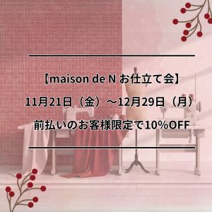maison de N お仕立て会 ❄️ この冬、自分のための一着を選ぶ時間 11月21日(金)〜12月29日(月) 冬の装いが楽しくなる季節に、maison de Nでは恒例のお仕立て会を開催いたします。 期間中、前払 […]